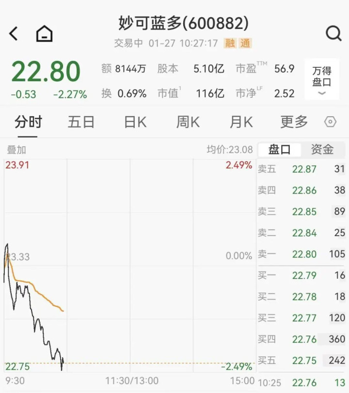 1月27日,妙可蓝多股价跌超2%,最新市值116亿元。